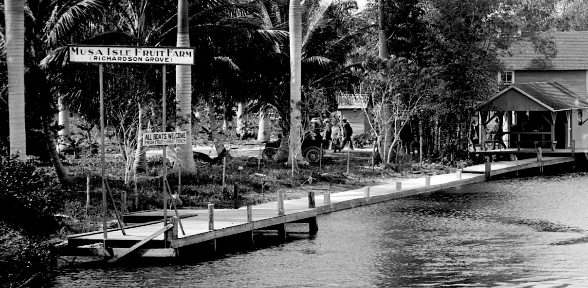 On the Miami River, near the NW 27th Avenue bridge, was Richardson’s Musa Isle fruit farm at the turn of the 20th century. He may have formed the first farming co-op in Miami by encouraging neighboring farmers to have their fruit processed at his canning facility. One of his prized products was guava jelly. Boats from the Royal Palm Hotel would come down the Miami River with their guests at the grove. In 1907 the grove was sold and became the Musa Isle Seminole Indian Village.
