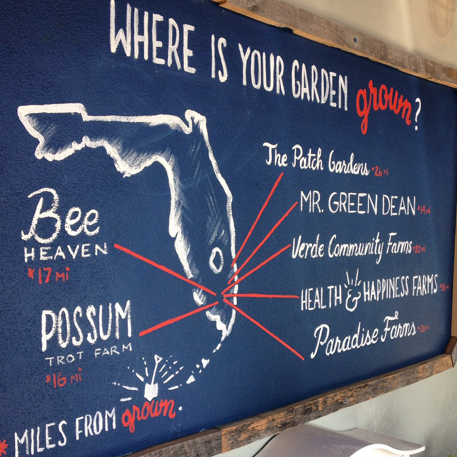 Still in its soft-open stage, Grown has a menu filled with all the right buzzwords: organic, local, vegan, gluten-free, paleo, family friendly. The restaurant, in a shopping center on busy South Dixie and Ludlam, sports the symbols of the farm-to-table movement: colorful displays of fruits, a rustic facade made from old barn wood, a rooftop garden – and the requisite blackboard listing local farms along with a map showing their location.