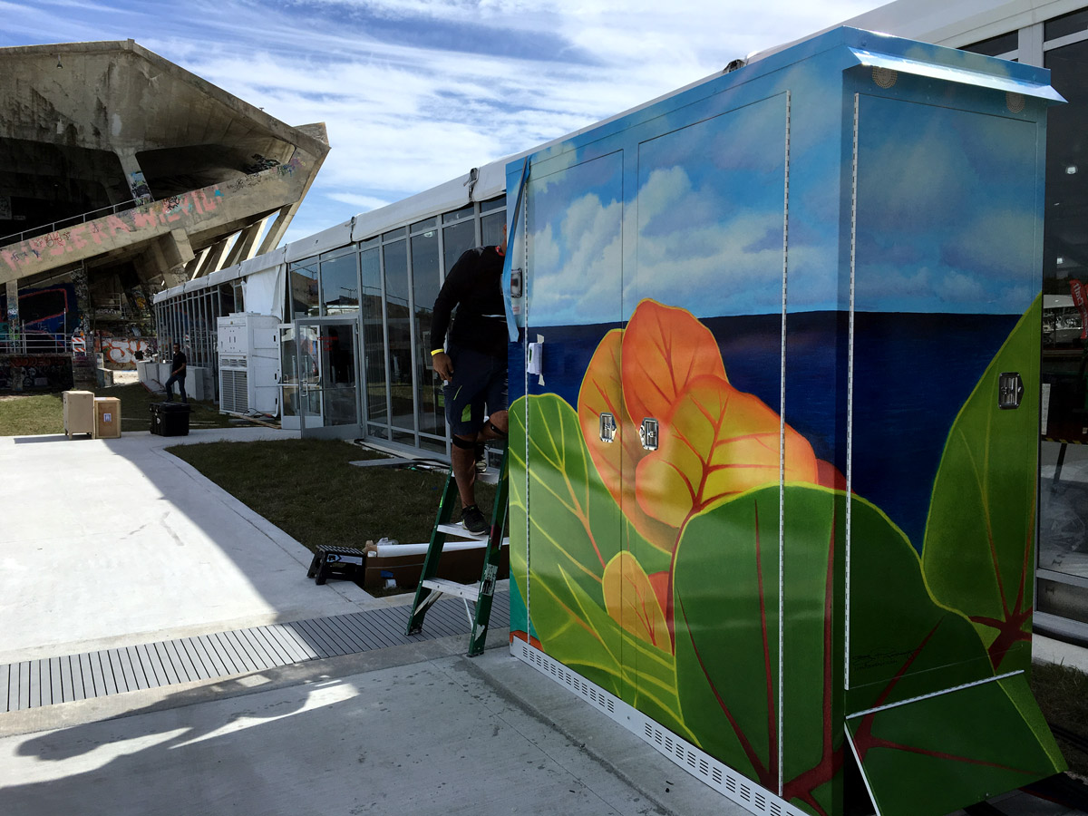 Remeny says the idea for the utility-box wraps came after a chance meeting with a classmate at a high school reunion. Vicky Stein Helms, who with her husband, Wade, owns Edd Helms Group Electrical and Air Conditioning, had been following Remeny’s work over the years. “Wade was working on the 75th Annual Miami Boat Show and had the idea to dress up his electrical cabinets over at the Miami Marine Stadium,” says Remeny.